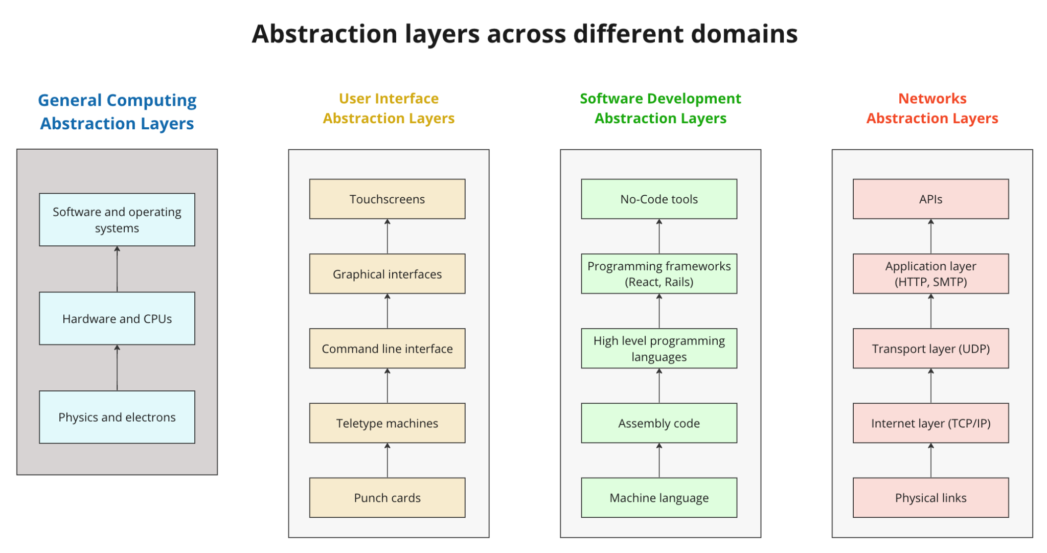 Abstraction layers also popped up in software development (from 1s and 0s all the way up to the no-code tools we use today), computer networks (from the internet’s predecessor ARPANET to modern-day APIs and Zapier), and how humans interact with computers (from punch cards to touching the screen of your iPhone to use a modern day app).