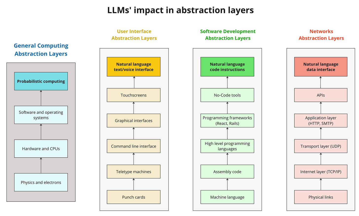 While the previous sections explored the impacts of LLMs in specific domains, these models can have an even greater impact when we look at computation itself. Computers started evolving as transistors abstracted away the physical complexity of vacuum tubes and electrons, then operating systems abstracted away the whole hardware stack into software, and finally high-level programming languages made the process of writing software a lot easier.